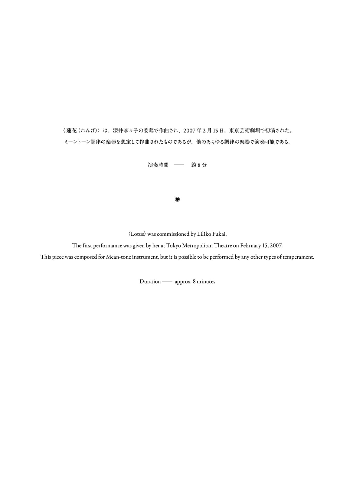 "Lotus" was commissioned by Liliko Fukai. The first performance was given by her at Tokyo Metropolitan Theatre on February 15, 2007.