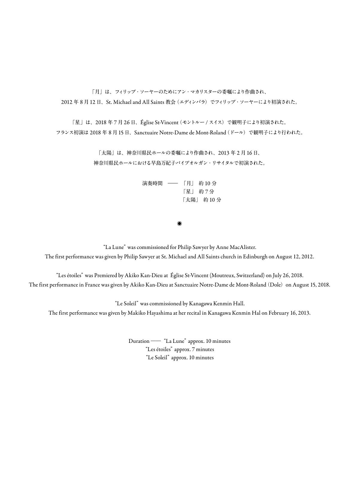 “Les étoiles” was composed in memoriam of Michel Chapuis. The first performance in France was given by Akiko Kan-Dieu at Sanctuaire Notre-Dame de Mont-Roland(Dole)on August 15, 2018.