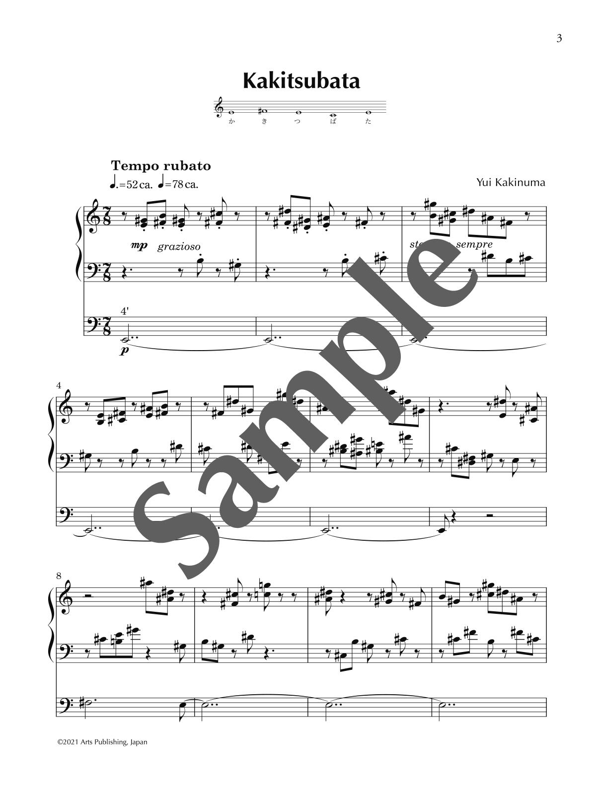 「かきつばた」の五文字に当てはめた五音のモットーを定旋律にしている。都節音階による日本的な特徴を持たせ、同時に聖霊降臨祭のグレゴリオ聖歌Veni Creator Spiritusの最初の部分とも共通する音形、mi-fa♯-mi-do-mi。初夏の風に乗せて夢幻の世界に遊ぶ。